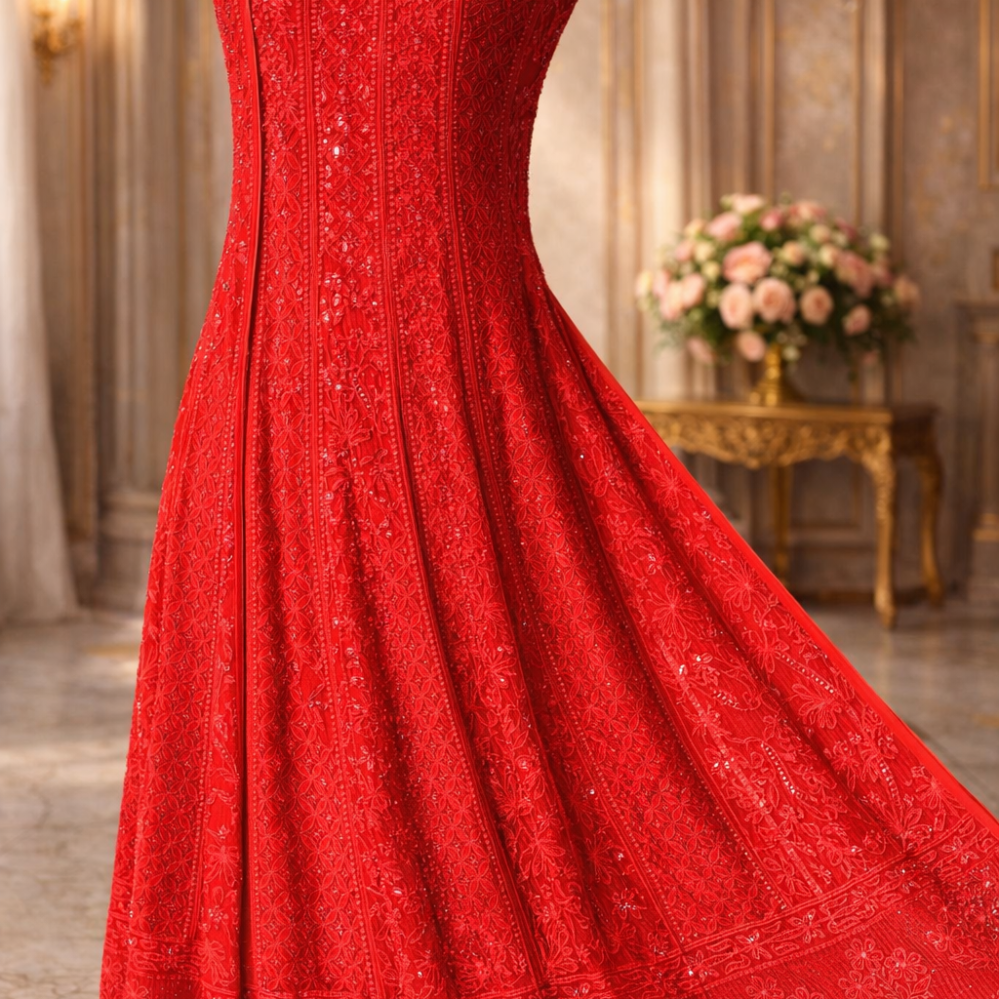 Chikankari with Cut Dana Pearl Anarkali with Dupatta (Chilli Red)