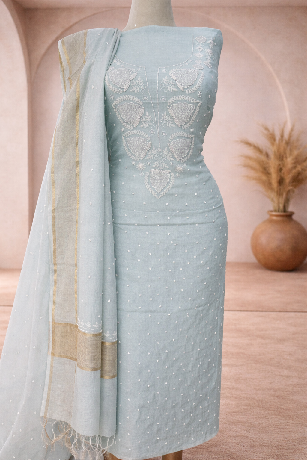 Be the first to review “Mul chanderi Chikankari pearl embroidered kurta and dupatta (Off Blue)” Cancel reply